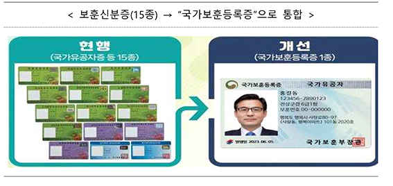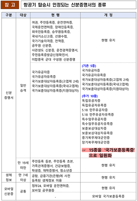 국가보훈부가 기존의 15종에 달하는 보훈신분증을 하나의 ‘국가보훈등록증’으로 통합(2023.6월)하고, 국토교통부에서 통합된 신분증을 항공기 탑승 시 유효 신분증으로 인정하기로 결정했다.