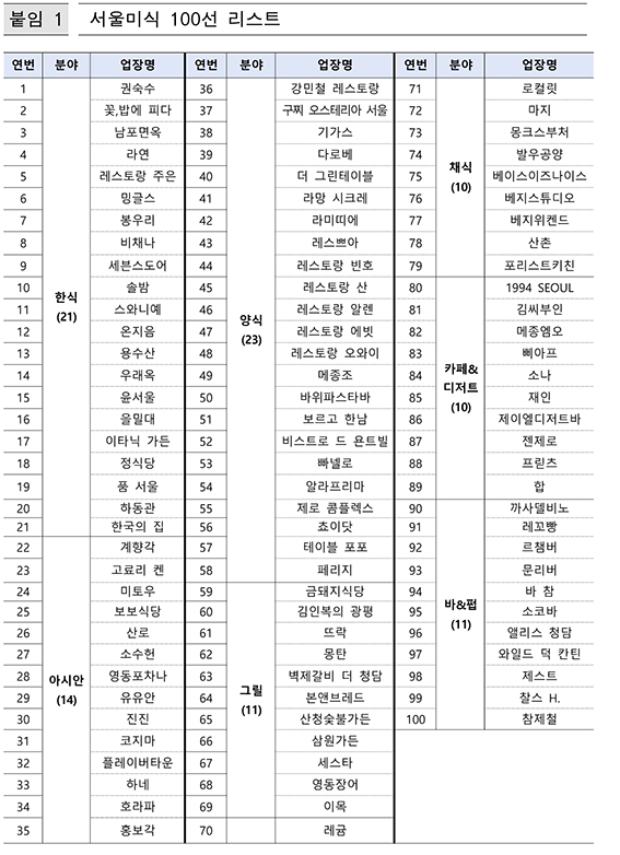 한식(21곳), 아시안(14곳), 양식(23곳), 그릴(11곳), 채식(10곳), 카페&디저트(10곳), 바&펍(11곳) 총 7개 분야로 구성되었으며 전통과 현대 사이에서 흥미로운 변주를 만드는 ‘한식’뿐만 아니라 장르의 경계를 넘어서는 ‘양식’ 등 서울에서 꼭 맛봐야 할 100곳을 만날 수 있다.