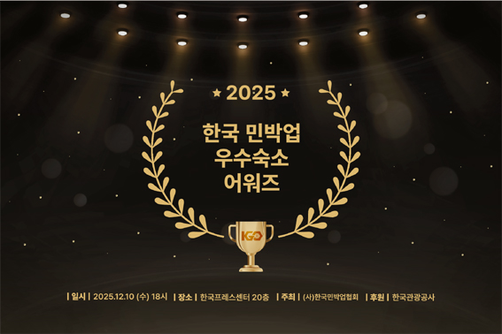 한국관광공사(사장직무대행 서영충)는 한국민박업협회와 함께 ‘2025년 한국 민박업 우수 숙소’ 10개소를 최종 선정해 12월 10일 한국 프레스센터에서 시상식을 개최한다.