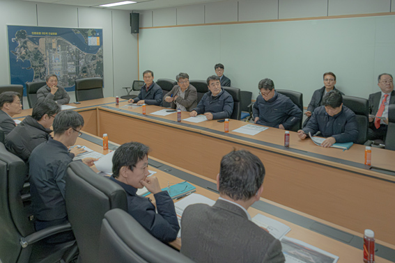 지난 1월 8일 이하재 인천국제공항공사 사장(가운데) 및 공사 임직원들이 아시아나항공의 제2여객터미널 이전 준비 관련 회의를 진행하고 있다.