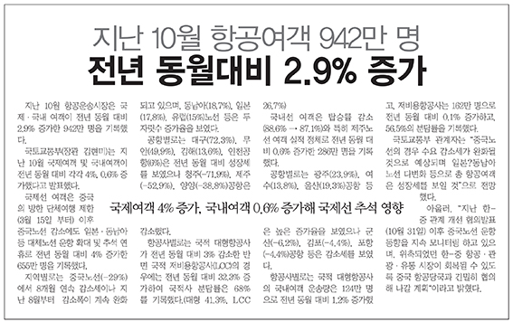 - 지난 10월 항공여객 942만 명 전년 동월대비 2.9% 증가