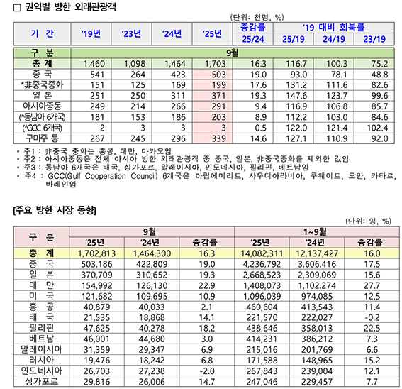 - 9월 방한 외래관광객 전년 동월대비 16.3% 증가한 170만명
