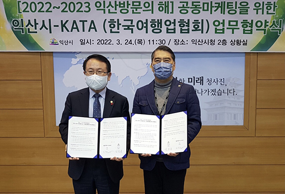 오창희 한국여행업협회 회장(오른쪽)과 정헌율 익산시장(왼쪽)이 지난 3월 24일 익산시청에서 업무협약을 체결하고...[제1172호]2022-03-25 10:40
