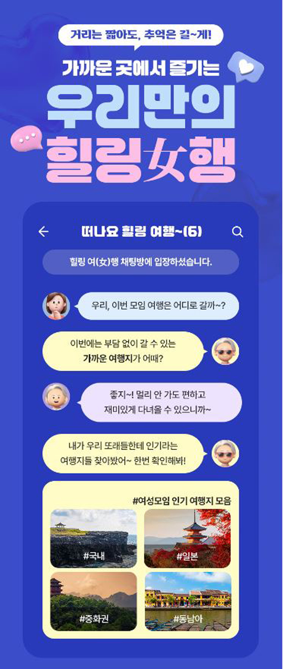 지난 9월 16일부터 2주간 진행되는 이번 기획전은 자사 데이터 기반 여행상품 선정을 통해 중·장년 여성 모임 고객이 편리하게 즐길 수 있는 최적화된 여행지를 제안하기 위해 마련됐다. 특히 카카오톡·네이버 밴드 등의 채팅방에서 친구들과 함께 여행을 계획하는 듯한 대화 형식의 감각적인 기획전 콘셉트를 적용해 고객 친밀도를 높인 것이 특징이다.