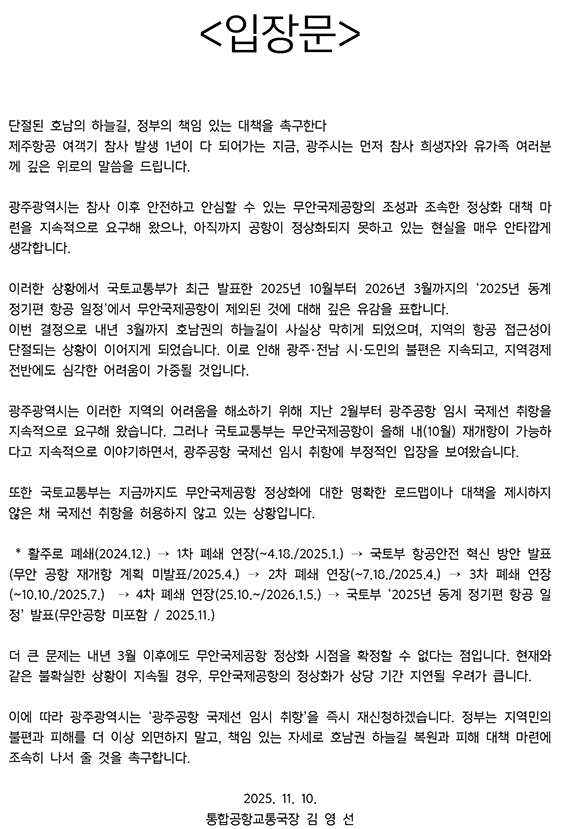 광주광역시는 김영선 통합공항교통국장 명의의 입장문을 통해 “최근 국토교통부는 ‘2025년 동계 정기편 항공 일정’(2025년 10월부터 2026년 3월)에서 무안국제공항을 제외했다”며 “이는 내년 3월까지 지역의 항공 접근성이 단절되는 상황이 이어져 광주·전남 시도민들의 불편은 지속되고 지역경제 전반에도 심각한 어려움이 가중될 것”이라고 깊은 유감을 표했다.