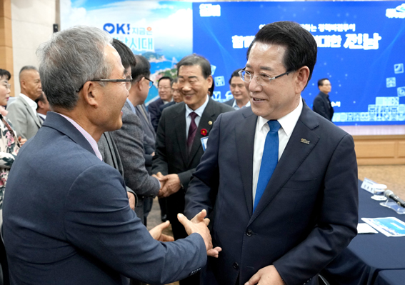 김영록 전라남도지사가 지난 11월 13일 여수시청 대회의실에서 열린 ‘여수시 정책비전 투어’ 행사에서 참석자들과 인사를 나누고 있다.