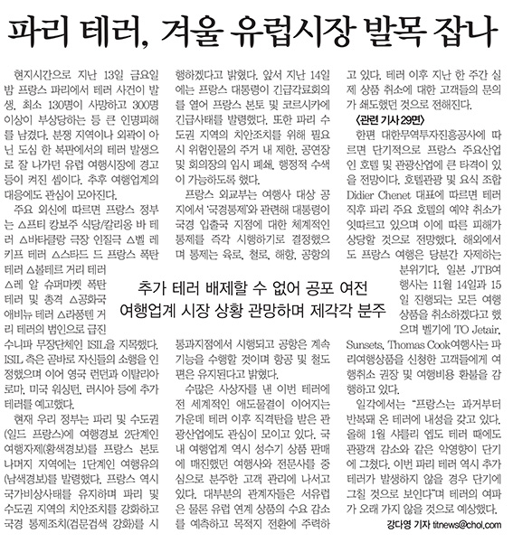 수많은 사상자를 낸 이번 테러에 전 세계적인 애도물결이 이어지는 가운데 테러 이후 직격탄을 받은 관광산업에도 관심이 모이고 있다. 국내 여행업계 역시 성수기 상품 판매에 매진했던 여행사와 전문사를 중심으로 분주한 고객 관리에 나서고 있다.