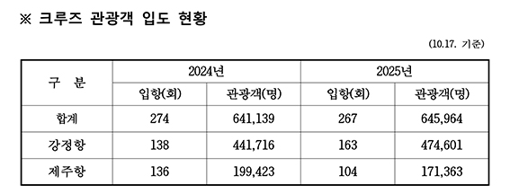 10월 17일 당일에는 대형 크루즈선 3척이 제주항과 강정항에 입항하면서 총 1만278명의 승객이 제주를 찾았다. 지난 5월에 이어 두 번째로 하루 방문객 1만 명을 돌파한 사례로,‘크루즈 관광객 하루 1만 명 시대’가 본격화되고 있음을 보여준다.