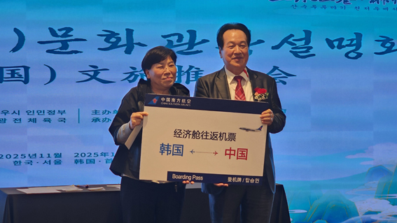 서일석 원코리아투어그룹 대표(오른쪽)가 경품 추첨에 당첨된 참석자에게 중국남방항공이 제공한 인천-중국 항공권을 전달하고 있다.