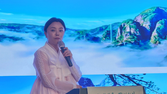 한복을 차려입은 천저우시 관계자가 천저우시 핵심 관광상품과 테마 여행루트 등을 설명하고 있다.