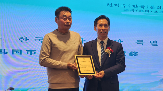 저우 하이린 천저우시 부시장(오른쪽)이 천저우시 문화관광 한국 여행시장 개척에 기여한 업체 대표에게 특별 공로패를 수여하고 있다.