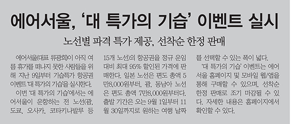 에어서울(대표 류광희)이 아직 여름 휴가를 떠나지 못한 사람들을 위해 지난 9일부터 기습특가 항공권 이벤트 ‘대 특가의 기습’을 실시한다.