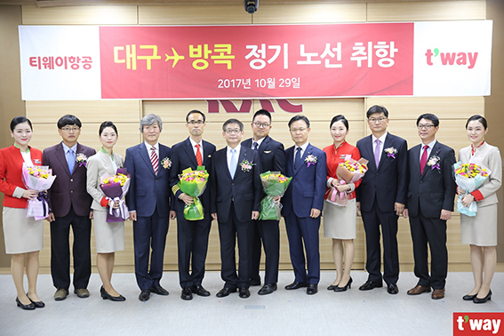 티웨이항공은 지난 달 29일 대구국제공항 여객터미널에서 남흥섭 한국공항공사 대구지사장, 김제헌 부산지방항공청 대구출장소장, 고혁 티웨이항공 서비스담당 상무, 김태희 티웨이항공 대구지점장 등이 참석한 가운데, 대구-방콕 정기 노선의 취항식을 가졌다.