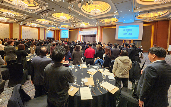 한국여행업협회 제33기 정기총회에서 참석자들이 국민의례를 하고 있다.
