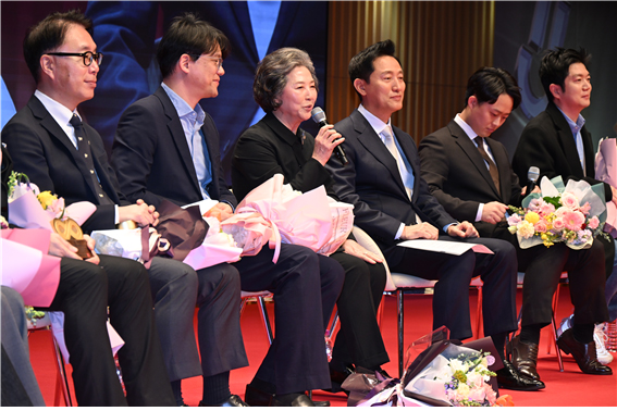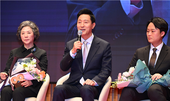 오세훈 서울시장(가운데)이 지난 12월 3일(화) 오전 서울시청 다목적홀에서 열린 서울시 명예시장 위촉식에서 마무리 인사말을 하고 있다. 왼쪽이 고두심씨.