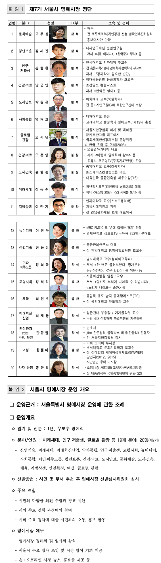 서울시는 금번 제7기 명예시장의 분야를 새롭게 개편하고 분야별로 사회 트렌드를 선도하는 영향력 있는 인물들로 구성했다.