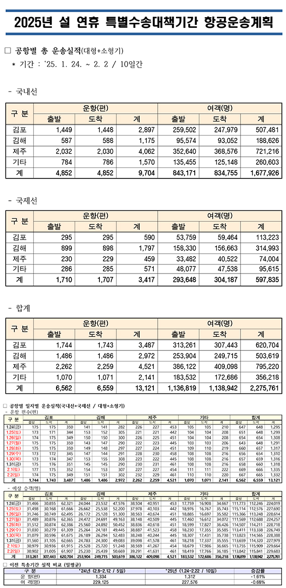 이 기간 전국공항(인천공항 제외) 이용객은 국내선 168만 명, 국제선 60만 명, 총 228만여 명으로 일 평균 이용객은 전년 수준인 약 23만여 명으로 예측된다. 올해는 임시공휴일 지정 등으로 설 연휴기간이 길어져 지난해 이용객 115만 명보다 두 배 가까이 증가할 것으로 보인다.