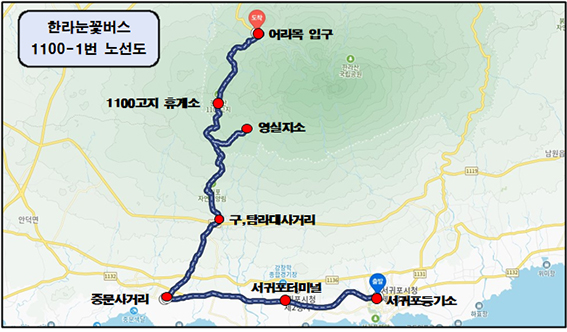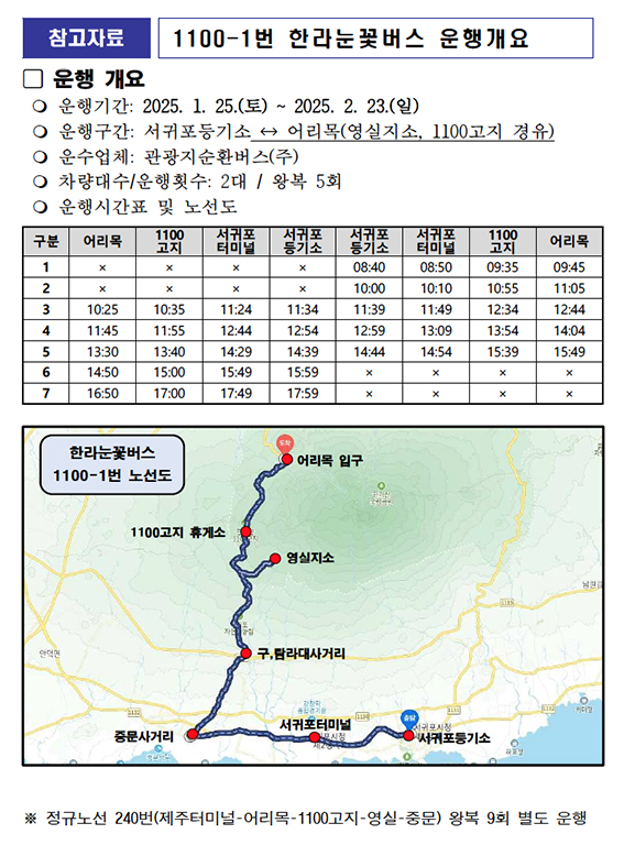 서귀포등기소-어리목 구간을 운행하는 한라눈꽃버스 노선번호는 1100-1번으로, 오는 2월 23일까지 주말 및 공휴일에 하루 10회 운행할 예정이다.
