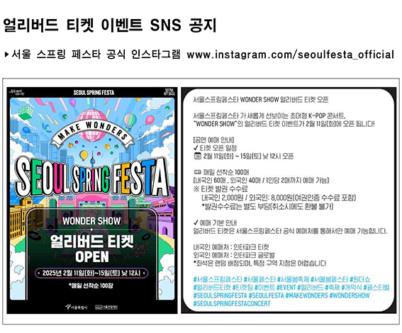개막식 ‘서울 원더쇼’ 입장권 무료 사전 예매 이후 공식 티켓 판매는 오는 3월부터 순차적으로 열릴 예정이며, 자세한 일정은 누리집(seoulfesta.com) 및 인스타그램(@seoulfesta_official)에서 확인할 수 있다.