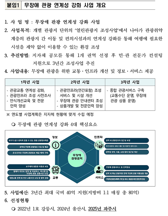 ‘무장애 관광 연계성 강화 사업’은 고령자, 장애인, 영유아 동반 가족 등 관광취약계층의 관광 향유권을 보장하기 위해 권역 내 무장애 관광을 위한 교통, 숙박, 음식점 등 분절적 시설과 서비스를 연결하여 여행 과정 전반의 편의성을 개선하는 사업이다. 경기도 파주시는 강원도 강릉시(2022년 선정), 울산광역시(2024년 선정)에 이어 세 번째로 선정됐다.