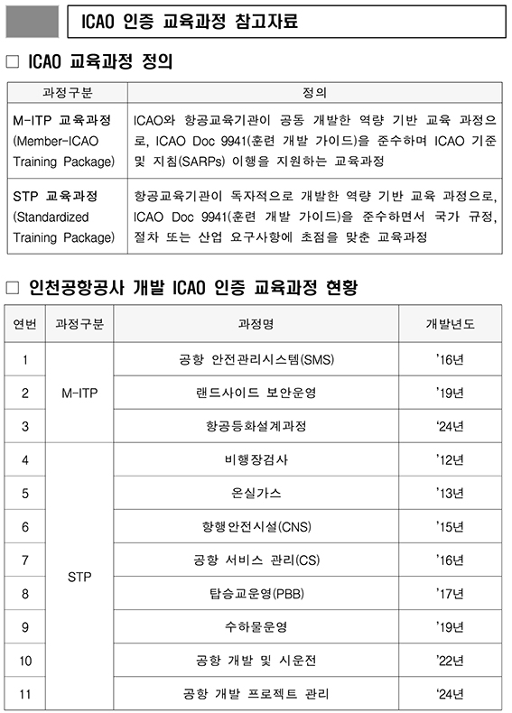 인천공항공사 항공교육원은 지난 2011년 세계 최초로 ICAO 항공 전문 국제교육기관 인증 프로그램의 정회원 인증을 획득한 이후, 3개의 M-ITP 과정(공항안전관리, 랜드사이드 보안, 항공등화설계과정)을 포함해 총 11개의 ICAO 인증 교육과정을 개발했다.