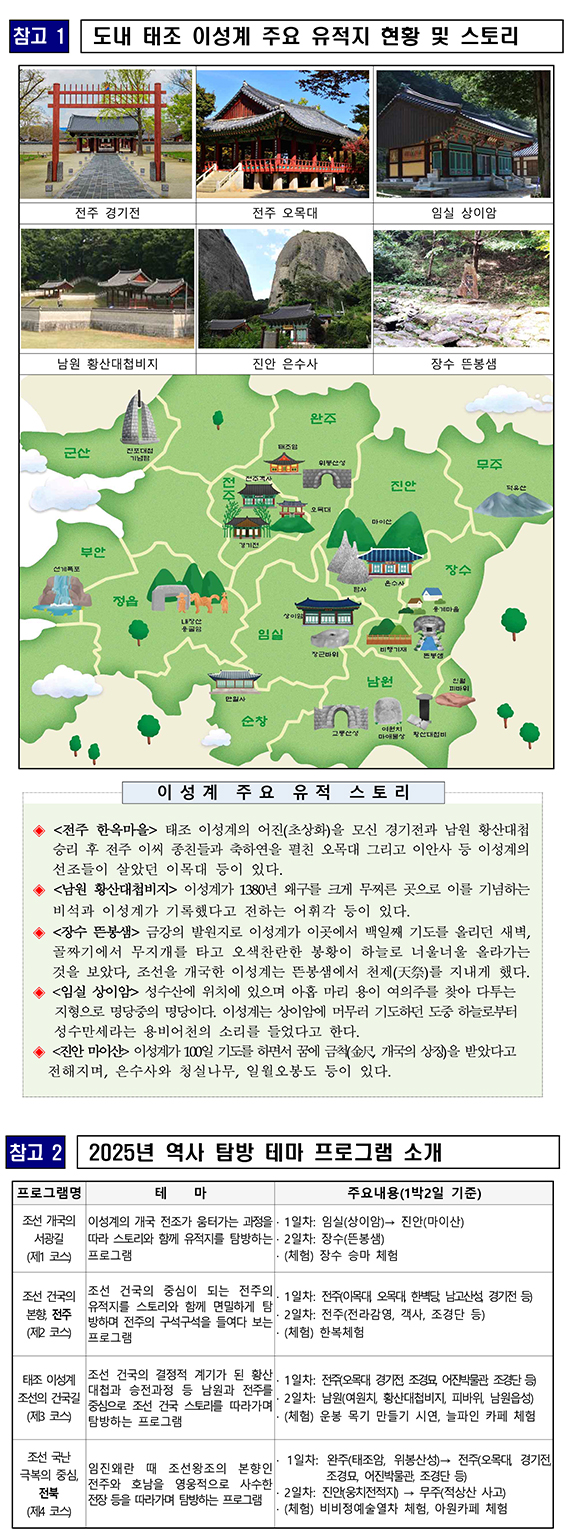 주요 탐방지는 전주시 한옥마을(오목대, 경기전, 조경단), 남원시(황산대첩비, 여원치, 피바위), 임실군(성이암), 장수군(뜬봉샘, 용계마을), 진안군(마이산 탑사, 은수사), 순창군(만일사), 완주군(태조암, 위봉산성, 웅치전적지) 등이다.