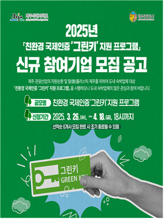 제주특별자치도가 친환경 숙박문화 확산을 위해 도내 숙박업체를 대상으로 2025년 그린키(Green Key) 국제 인증 지원 프로그램 참여 기업을 모집한다.