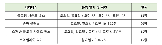주말 오전에는 도심 속 숨겨진 정원, 워터풀 가든에서 ‘줌바 클래스’가 펼쳐진다. 신나는 음악과 함께 에너지를 충전할 수 있는 줌바 세션을 통하여 참가자들에게 활력을 불어넣을 예정이다. 오후에는 힐링 멘토 오드리 코치와 진행하는 ‘요가와 플로팅 사운드 배스’ 프로그램이 야외 수영장에서 진행된다. 요가로 몸을 이완시킨 후, 이어지는 플로팅 사운드 배스를 통해 깊은 명상과 휴식을 경험할 수 있다. 한 주의 시작을 건강하게 열고자 하는 이들에게는 월요일 저녁 7시에 워더풀 가든에서 서홍 코치가 진행하는 ‘트와일라잇 요가’가 안성맞춤일 것이다.