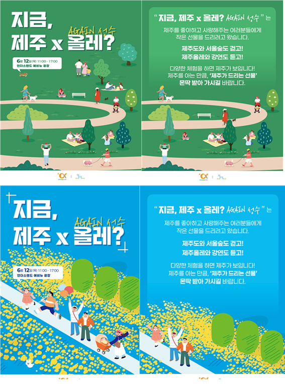 제주특별자치도 중앙협력본부와 ㈔제주올레가 6월 12일 오전 11시 성수동 언더스탠드에비뉴 광장에서 <제주 알리기 프로그램: 지금, 제주×올레? AGAIN 성수>를 개최한다.
