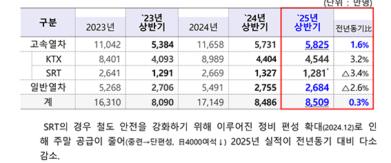 한편, 일반철도(무궁화, ITX-마음 등)의 상반기 수송인원은 2,680만명으로 전년 2,760만명 대비 2.6% 감소해 꾸준히 증가하고 있는 고속철도와는 대조를 이뤘다.