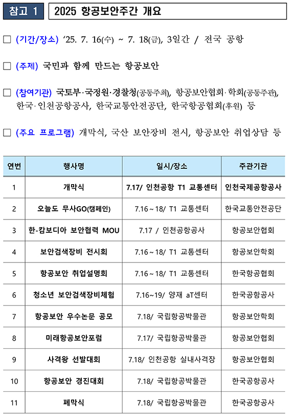 참여 기관은 국토부·국정원·경찰청(공동 주최), 항공보안협회·학회(공동 주관), 인천국제공항공사, 한국공항공사, 한국교통안전공단, 한국항공협회(후원) 등이다.