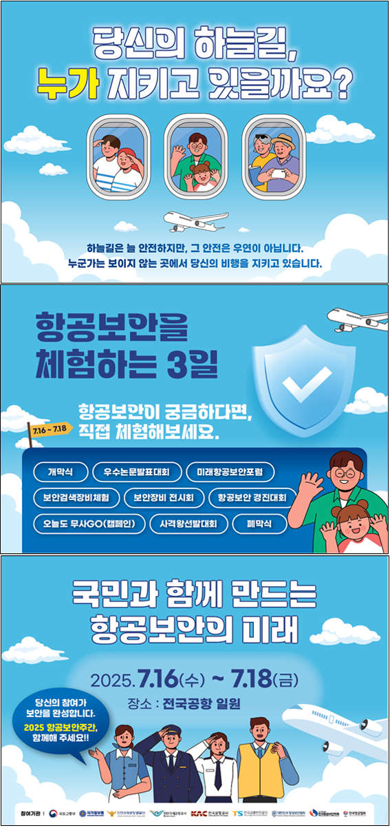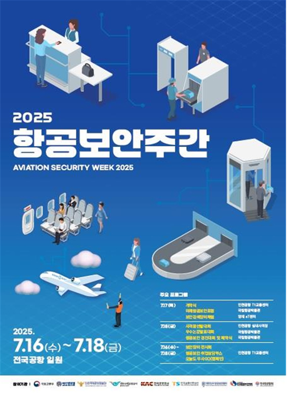 국토교통부(장관 박상우)는 국가정보원, 경찰청과 함께 7월 16일부터 오는 18일까지 3일간 인천, 김포, 김해 등 전국 15개 공항에서 ‘2025 항공보안주간’을 개최한다.