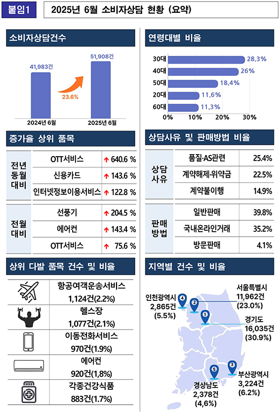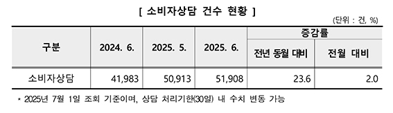 지난 6월 소비자상담은 5만1,908건으로 전월(5만913건) 대비 2.0%(995건), 전년 동월(41,983건) 대비 23.6%(9,925건) 증가했다.