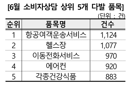 지난 6월 소비자상담 다발 품목은 ‘항공여객운송서비스’(1,124건), ‘헬스장’(1,077건), ‘이동전화서비스’(970건) 등의 순이었다. 여름 휴가철 항공권 취소 관련 상담과 대형 헬스장의 폐업 그리고 SKT 유심(USIM) 해킹 사고에 따른 소비자상담이 많았다.