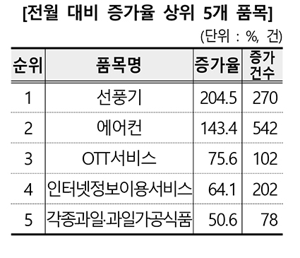 전월 대비 증가율은 고객센터 연결 지연 등으로 인한 ’선풍기‘ 관련 소비자상담이 3배로 증가하며, 가장 높은 증가율을 보였다.