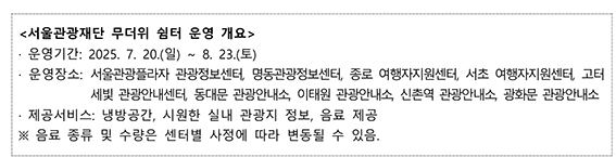 서울관광재단(대표이사 길기연)은 여름철 폭염에 대비하여 오는 7월 20일(일)부터 8월 23일(토)까지 약 한 달간 서울 시내 주요 관광정보센터 9개소를 한시적 ‘무더위 쉼터’로 운영한다고 밝혔다.