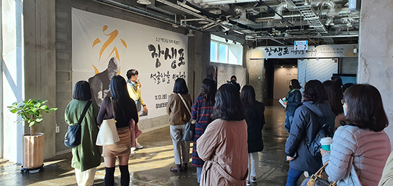 문화엑스포와 고래문화재단이 체결한 업무협약 이후 실무 교류로 추진한 박대성 화백 전시 '장생포 석굴암을 만나다' 안내를 듣고 있는 관람객.