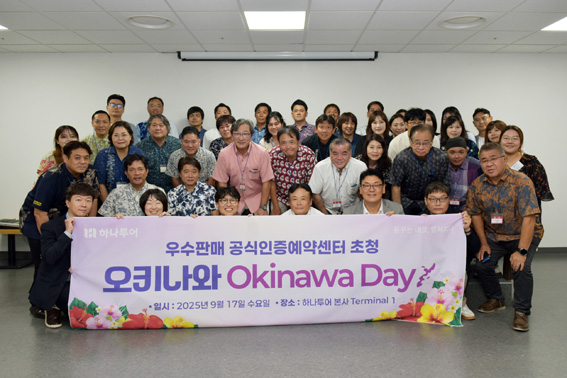 하나투어 2025 오키나와 DAY에서 하나투어 임직원 및 하나하나카이 협회원들이 단체 사진을 촬영하고 있다.