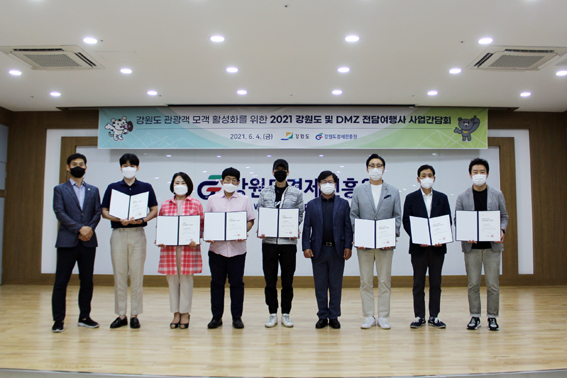 경정균 하나투어 상무(사진 오른쪽 첫번째)가 강원도 DMZ 관광 전담여행사 지정증 수여식 후 단체 기념 촬영을 하...[제1142호]2021-06-09 11:32