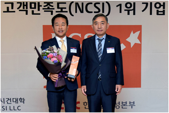 하나투어 김진국 대표이사(사진 왼쪽)가 2019 NCSI 여행사 서비스업 부문 1위 수상 후 기념 촬영을 하고 있다.