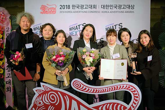 박현경 하나투어 IMC전략총괄팀장(가운데)이 대한민국 광고대상 수상 후 직원들과 함께 기념촬영을 하고 있다.