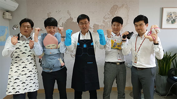 안규동 롯데제이티비 대표(중앙)가 고무장갑 등으로 구성된 ‘앞장키트’를 착용하고 가사와 육아의 분담 ...[제1025호]2018-04-13 08:34