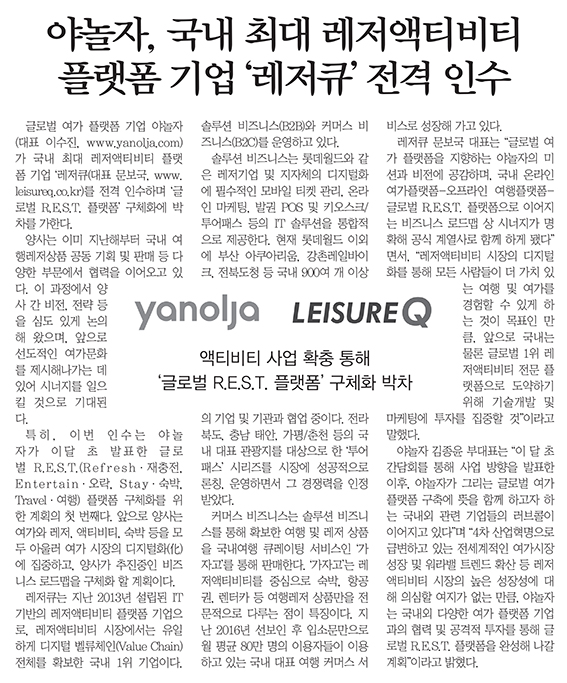 - 야놀자, 국내 최대 레저액티비티 플랫폼 기업 ‘레저큐’ 전...