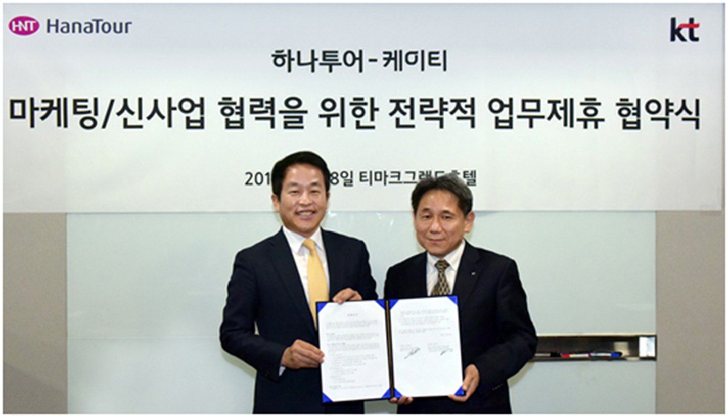 하나투어 김진국 대표이사(사진 왼쪽)가 KT 이필재 부사장(사진 오른쪽)과 업무협약 체결 후 기념사진 촬영에 임하...[제1020호]2018-03-09 11:14