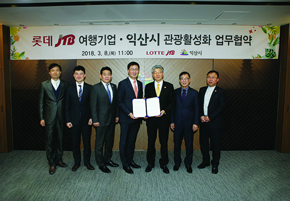 롯데제이티비가 지난 8일 전라북도 익산시와 관광 활성화 및 공동마케팅을 위한 업무협약(MOU)을 체결했다. 왼쪽에서...[제1021호]2018-03-16 09:14