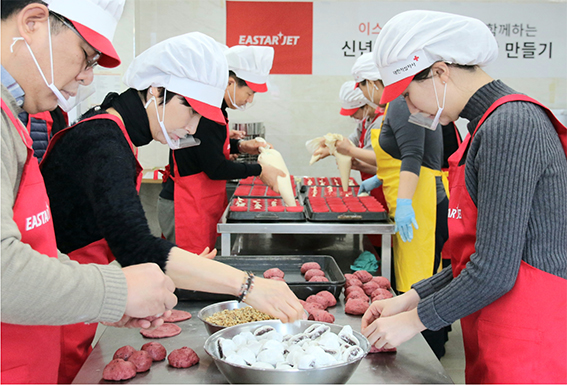 이스타항공 임직원들이 사랑의 응원빵만들기 활동을 진행하고 있다.