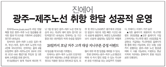 - 진에어, 광주-제주노선 취항 한달 성공적 운영