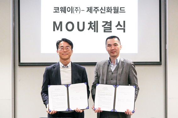 황웨이 제주신화월드 최고경영책임자(오른쪽)와 김순태 코웨이 경영관리본부장(왼쪽)이 업무협약을 체결하고 기념...[제1292호]2025-10-29 11:26
