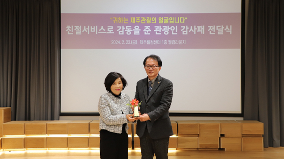 고승철 제주관광공사 사장(오른쪽)은 이번 설 연휴를 맞아 제주를 찾은 관광객이 도내 국내여행안내사의 서비스에 감...[제1236호]2024-02-26 10:31