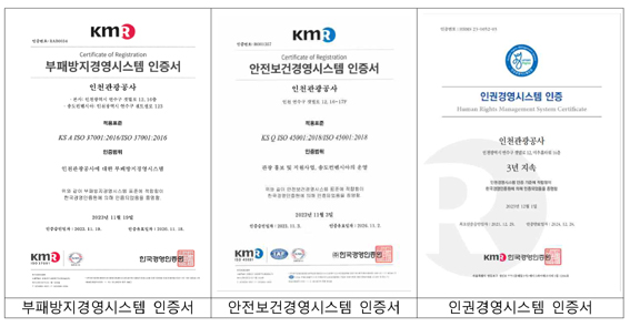 부패방지경영시스템, 안전보건경영시스템, 인권경영시스템 3개 인증 획득